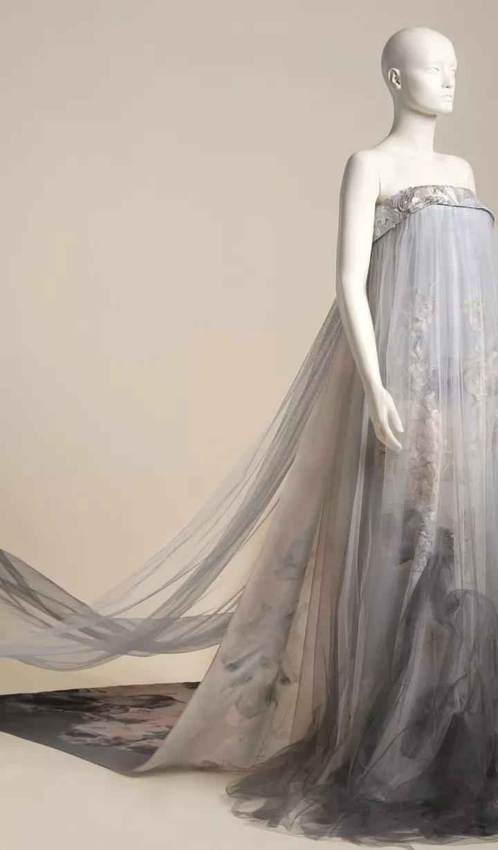 《风荷舞》作品一共分为三组,设计灵感来源于中国水墨画中风中荷叶飞舞的意像,作品采用了手绘、刺绣、晕染绣等工艺,将中国传统美学与现代设计完美融合,让东方女性如同风中轻舞的墨荷,摇曳生姿,动静之中展现变幻的灵性之美。